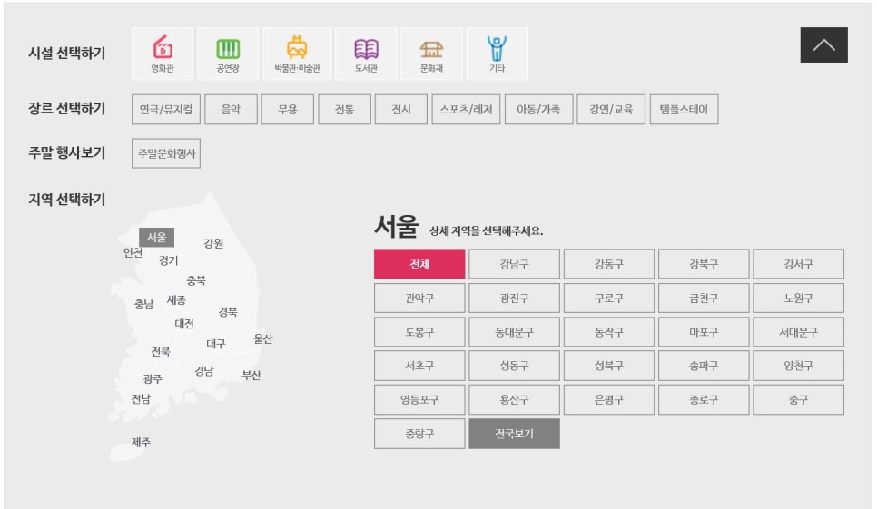 해당지역 상세페이지가 나오고, 관람하려는 장소가 있는 '구'선택