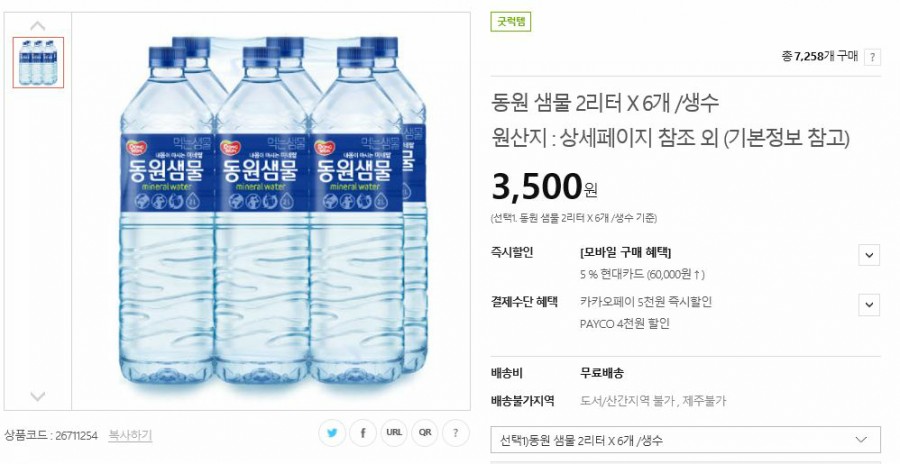 동원 샘물 2리터 *6개/생수 3,190원